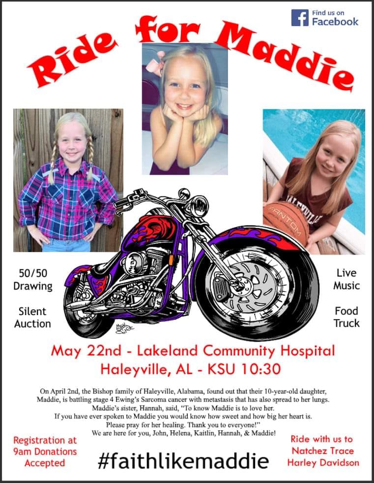 HALEYVILLE, Ala. (BIKER DAD) — On April 2nd, the Bishop family of Haleyville, Alabama, found out that their 10-year-old daughter, Maddie, is battling stage 4 Ewing’s Sarcoma cancer with metastasis that has also spread to her lungs.