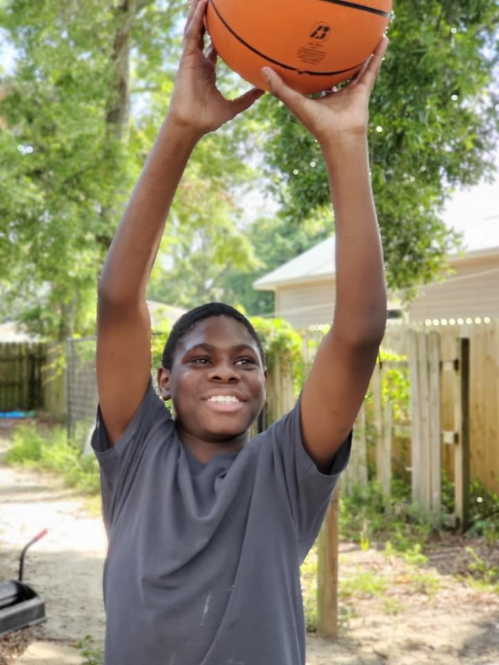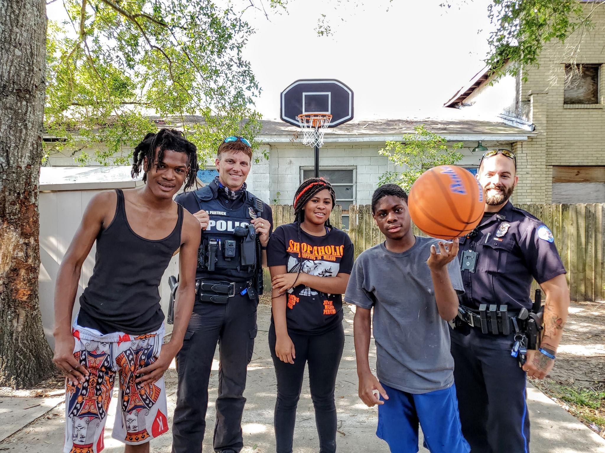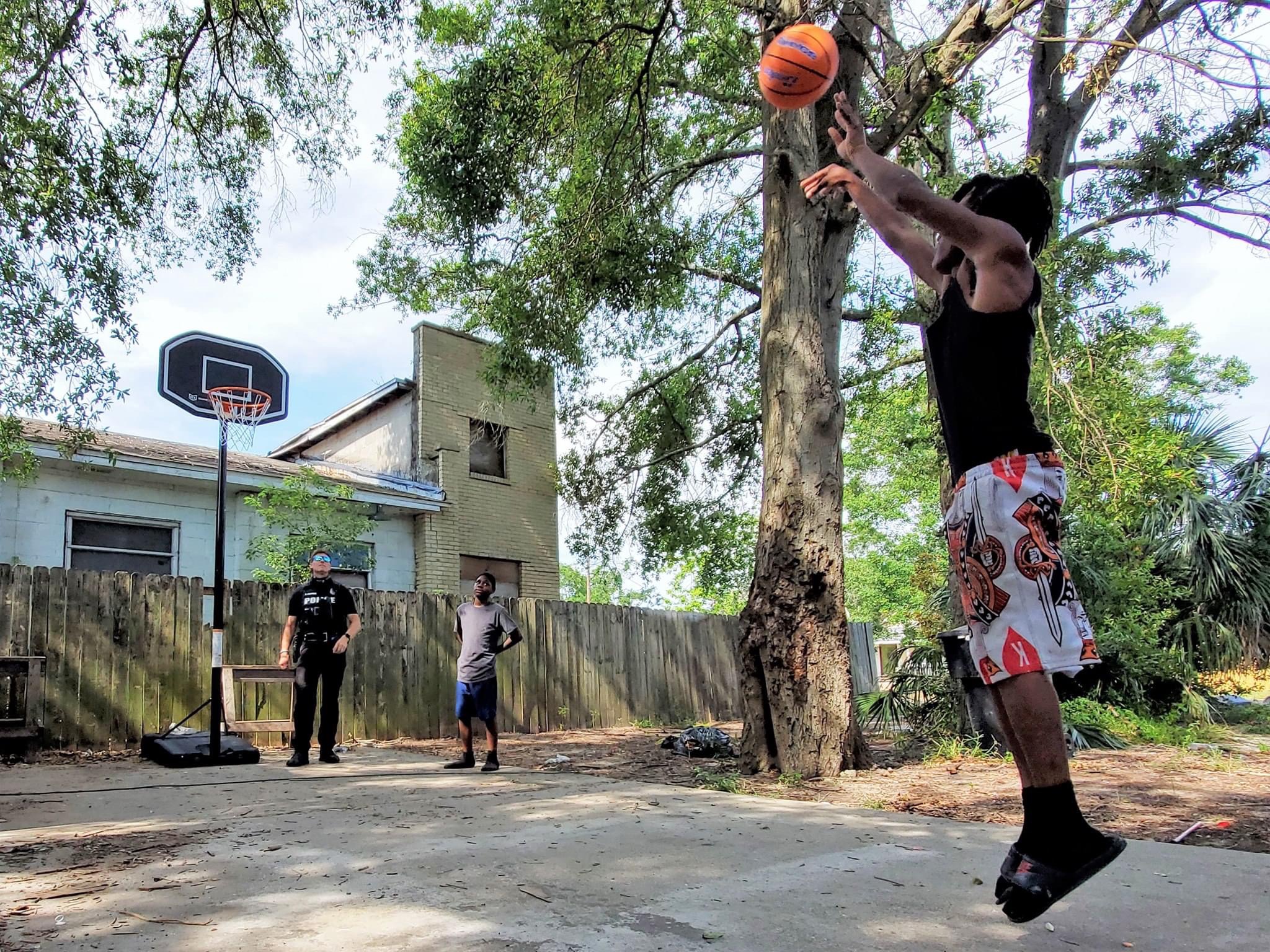 You show the cops your makeshift basketball hoop, which in reality is just a big flower pot propped up against a fence. It ain’t pretty but it’s cheaper than a new B-ball goal. The cops, Officers Hual and Partrick, toss the ball around with you, make some Dad jokes and take off.
