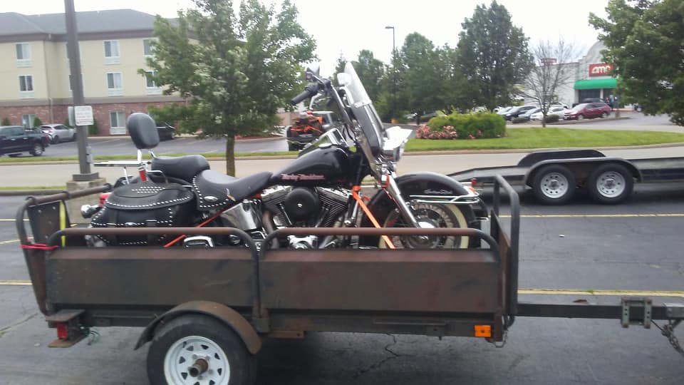 She says it happened, “after a very long drive from Minnesota to get the bike he parked it outside of his hotel which was the super 8 in Farmington Missouri. When he woke in the morning on May 29th the trailer and bike were gone!!”
