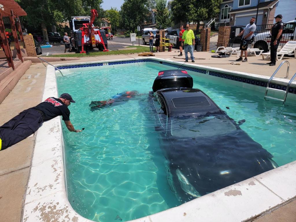 LAKEWOOD, Col. (BIKER DAD)– Caught on camera, a Teen with a learner’s permit drives into a swimming pool turning it into an “Infiniti Pool” . Lakewood, Colorado police posted the video and pictures on their Facebook page cleverly saying the pool was now an “Infiniti” pool.