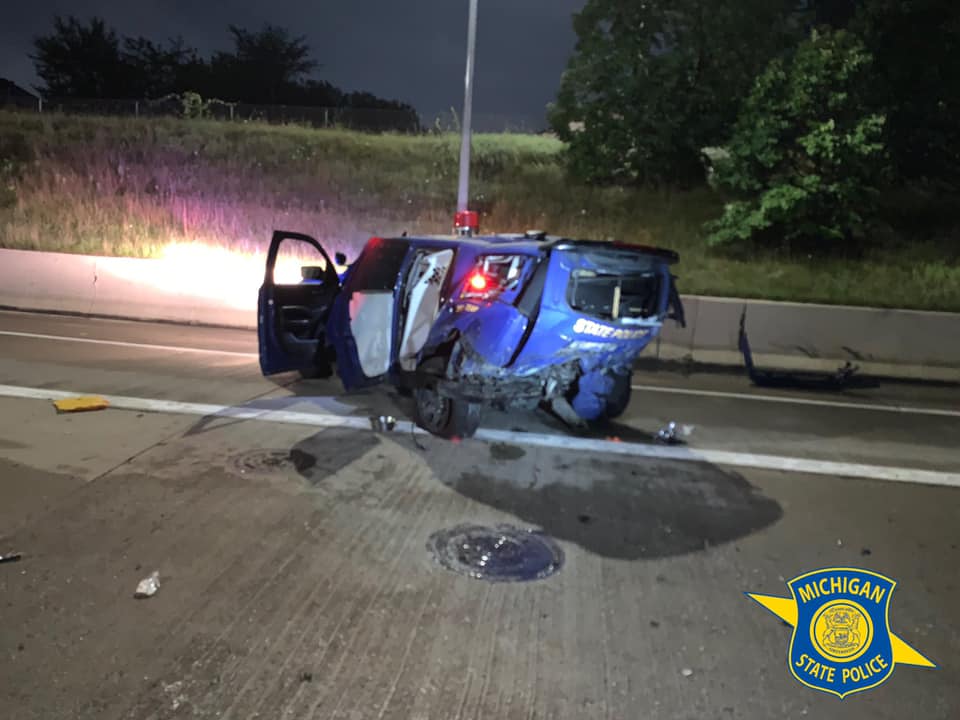 Police say the suspect was going full freeway speed when it slammed into the trooper’s Tahoe. Pictures show the large SUV bent into half its normal size.