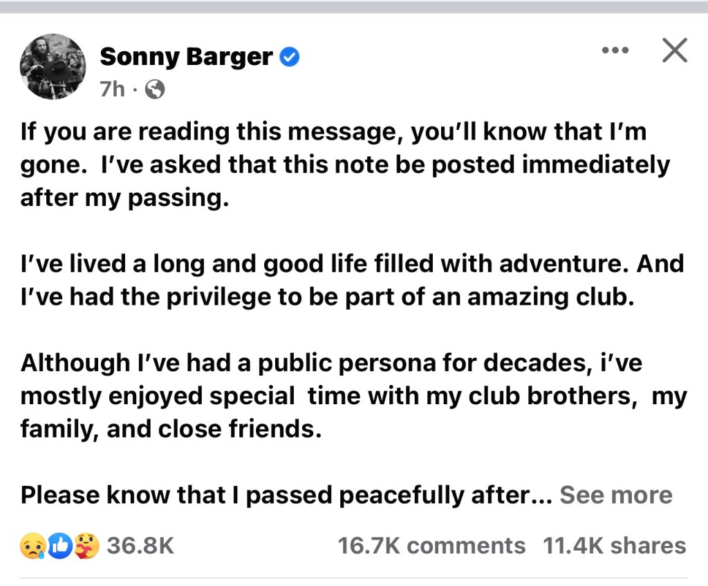 Hells Angels founder Sonny Barger has died of cancer at age 83.