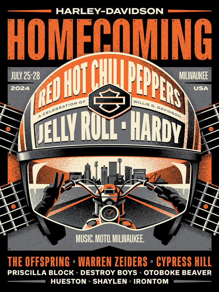 “Your 2024 Harley-Davidson Homecoming™ Lineup has arrived! We’re bringing Red Hot Chili Peppers, Jelly Roll, HARDY, The Offspring, Warren Zeiders, Cypress Hill and more to Veterans Park.